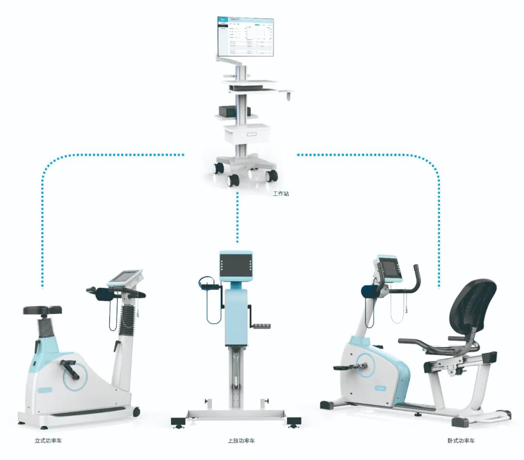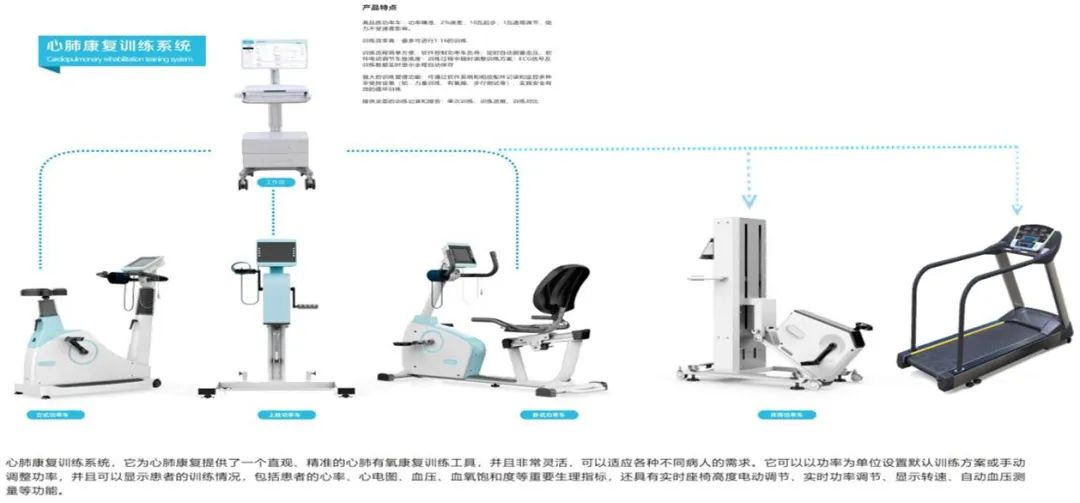 有氧训练系统,它为心肺康复提供了一个直观、精准的心肺有氧康复训练工具,并且非常灵活,可以适应各种不同病人的需求。它可以以功率为单位设置默认训练方案或手动调整功率,并且可以显示患者的训练情况,包括患者的心率、心电图血压、血氧饱和度等重要生理指标,还具有实时座椅高度电动调节、实时功率调节、显示转速、自动血压测量等功能。