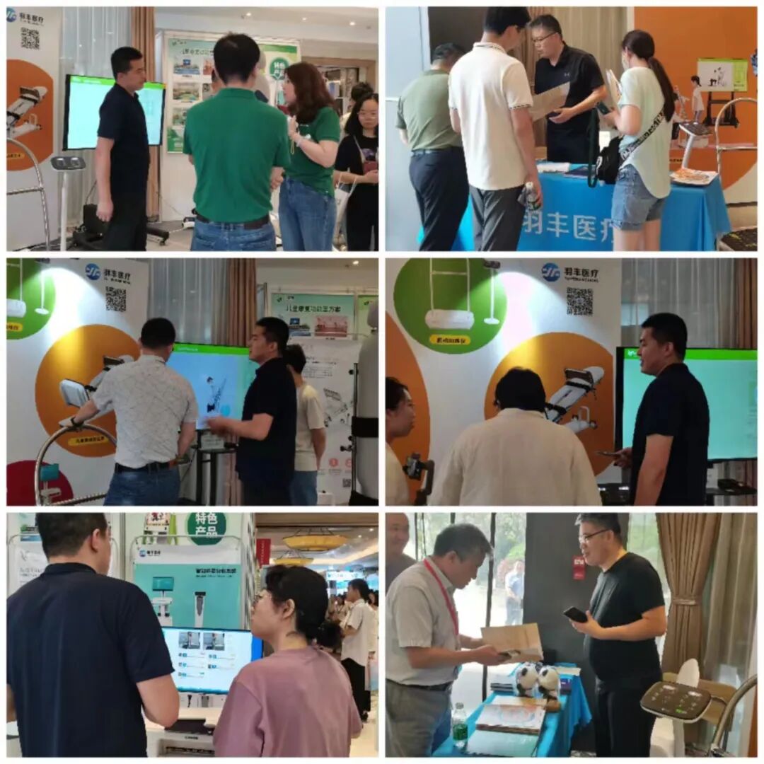 (羽丰医疗展位现场)展会期间,参与论坛的专家学者对羽丰医疗出品的振动训练仪产生了浓厚的兴趣,在市场部人员细致的产品讲解说明下,更深度的了解振动治疗技术在儿童康复领域的应用,并在羽丰产品讲师的现场指导下,进行了全方位、系统性的体验。