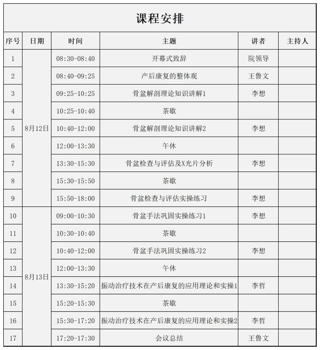 本次培训特邀请郑州大学第三附属医院王鲁文主任分享产后康复的整体观。李想老师分享骨盆手法。李哲老师分享振动治疗技术在产后康复的应用理论和实操。(课程安排详见附件)。