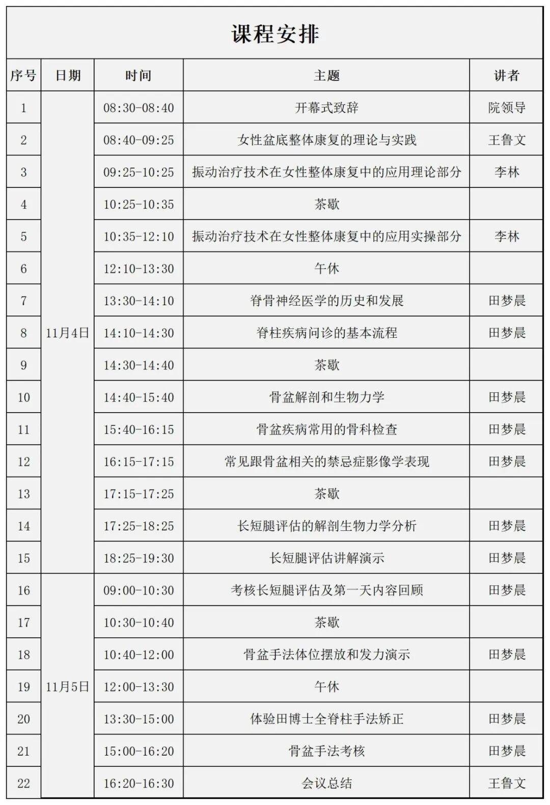 本次培训特邀请郑州大学第三附属医院王鲁文主任分享女性盆底整体康复的理论与实践;李林老师分享振动治疗技术在女性康复的应用理论和实操;田梦晨老师分享骨盆手法。(课程安排详见附件)