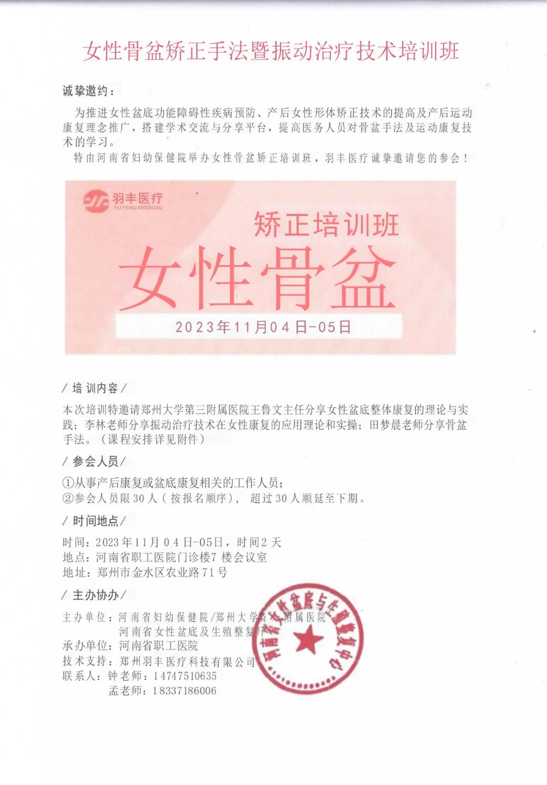 特由河南省妇幼保健院举办女性骨盆矫正培训班,羽丰医疗诚挚邀请您的参会!