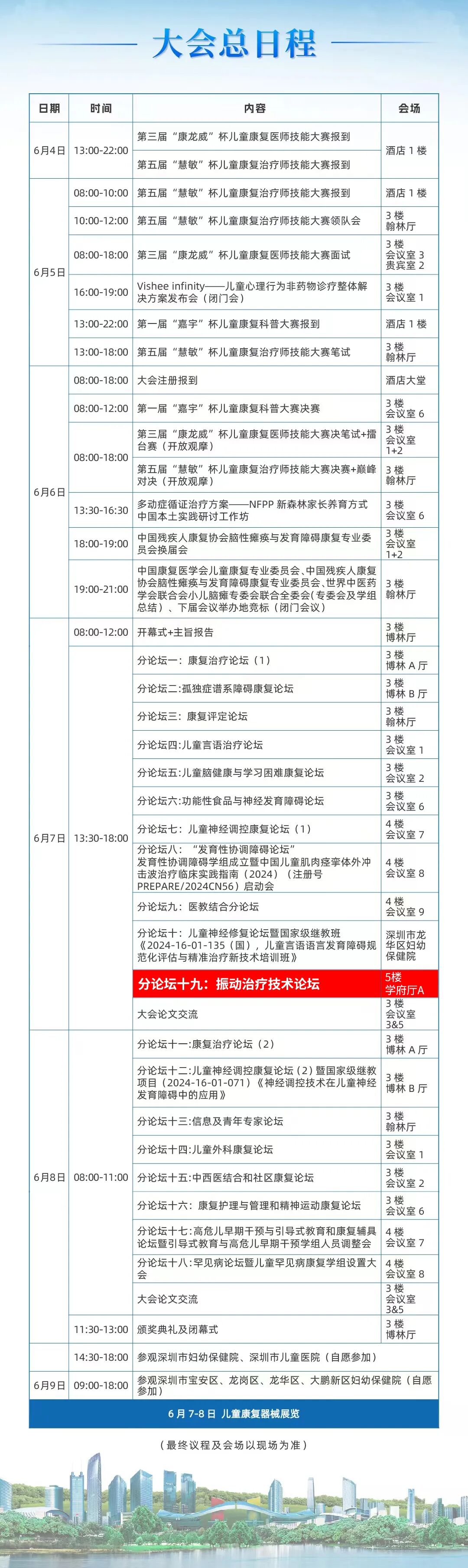 由中国康复医学会儿童康复专业委员会、中国残疾人康复协会脑性痪与发育障碍康复专业委员会、世界中医药学会联合会小儿脑瘫专业委员会联合主办,深圳市妇幼保健院、深圳市儿童医院、深圳市宝安区妇幼保健院、深圳市龙岗区妇幼保健院、深圳市龙华区妇幼保健院、深圳市大期新区妇幼保健院联合承办,广东省康复医学会儿童发育与康复分会、广东省妇幼保健院协会儿童康复专业委员会、深圳市康复医学会协办的第十届儿童康复、第十八届脑性瘫痪与发育障碍康复、第七届小儿脑瘫诊疗与康复学术会议,定于2024年6月6-8日在广东省深圳市召开。