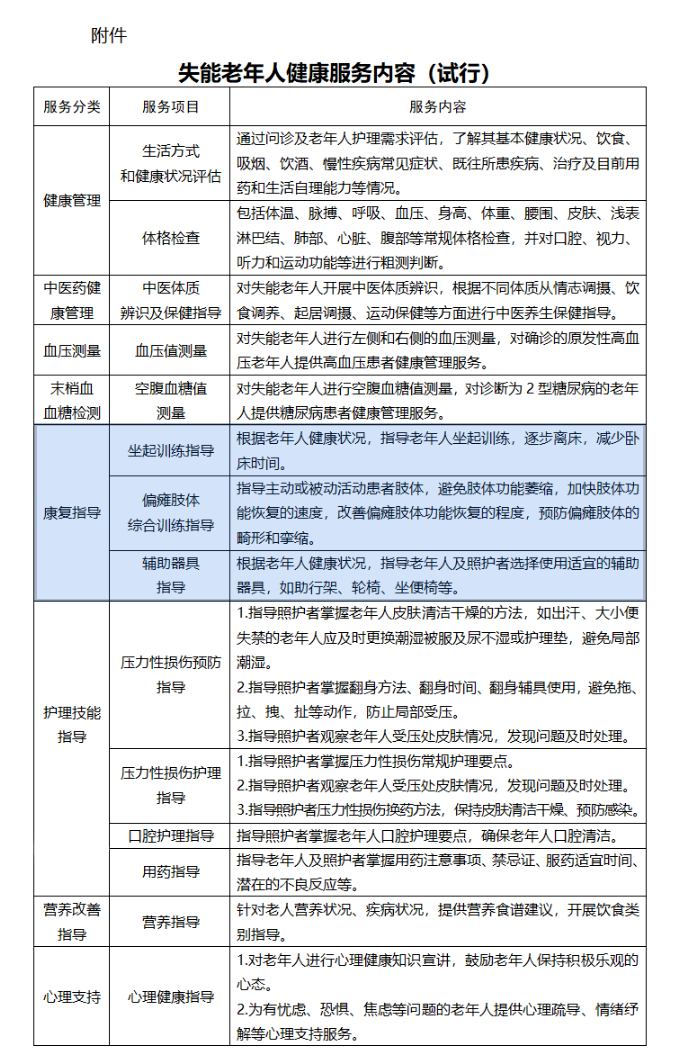 通知提出,失能老年人健康服务行动的服务内容包括开展健康服务、提供健康咨询、指导转诊转介等。其中明确,医疗卫生机构每年为失能老年人提供1次生活方式和健康状况评估、体格检查、中医体质辨识及保健指导等服务。各省份结合本地实际,为提出申请的老年人进行失能状况评估,上门为失能老年人提供血压测量、末梢血血糖检测、康复指导、护理技能指导、营养改善指导、心理支持等服务。