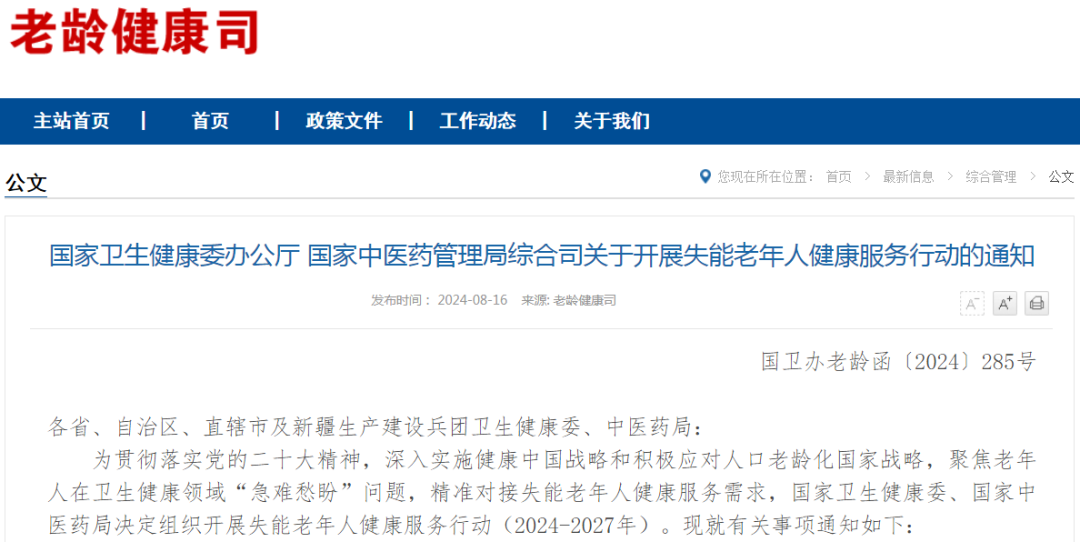 为贯彻落实党的二十大精神,深入实施健康中国战略和积极应对人口老龄化国家战略,聚焦老年人在卫生健康领域“急难愁盼”问题,精准对接失能老年人健康服务需求,国家卫生健康委、国家中医药局决定组织开展失能老年人健康服务行动(2024-2027年)。现就有关事项通知如下:一、行动目标
