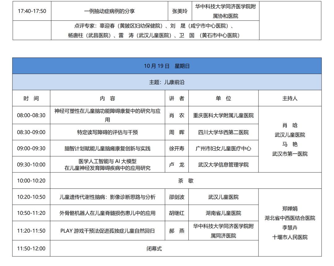 (二)第一届湖北省儿童康复优秀病例分享会通过儿童康复临床病例演讲分享最新诊疗理念,交流临床康复技能,促进我省儿童康复治疗技术的交流与发展,提升康复服务质量。截至报名结束,专委会共收到21个病例,经过遴选,最终确定10个优秀病例进行现场汇报。1.汇报时间:2025年10月18日16:10-17:50。具体日程见“附件1”。2.汇报PPT提交:请于2025年10月10日前,将PPT发送至邮箱huuyoung33@163.com,(注明病例名称+单位全称)。3.单个病例汇报时间在8分钟以内,汇报完毕由专家组进行点评,点评时间2分钟,点评规则见“附件2”。4.汇报成员须注册参会。