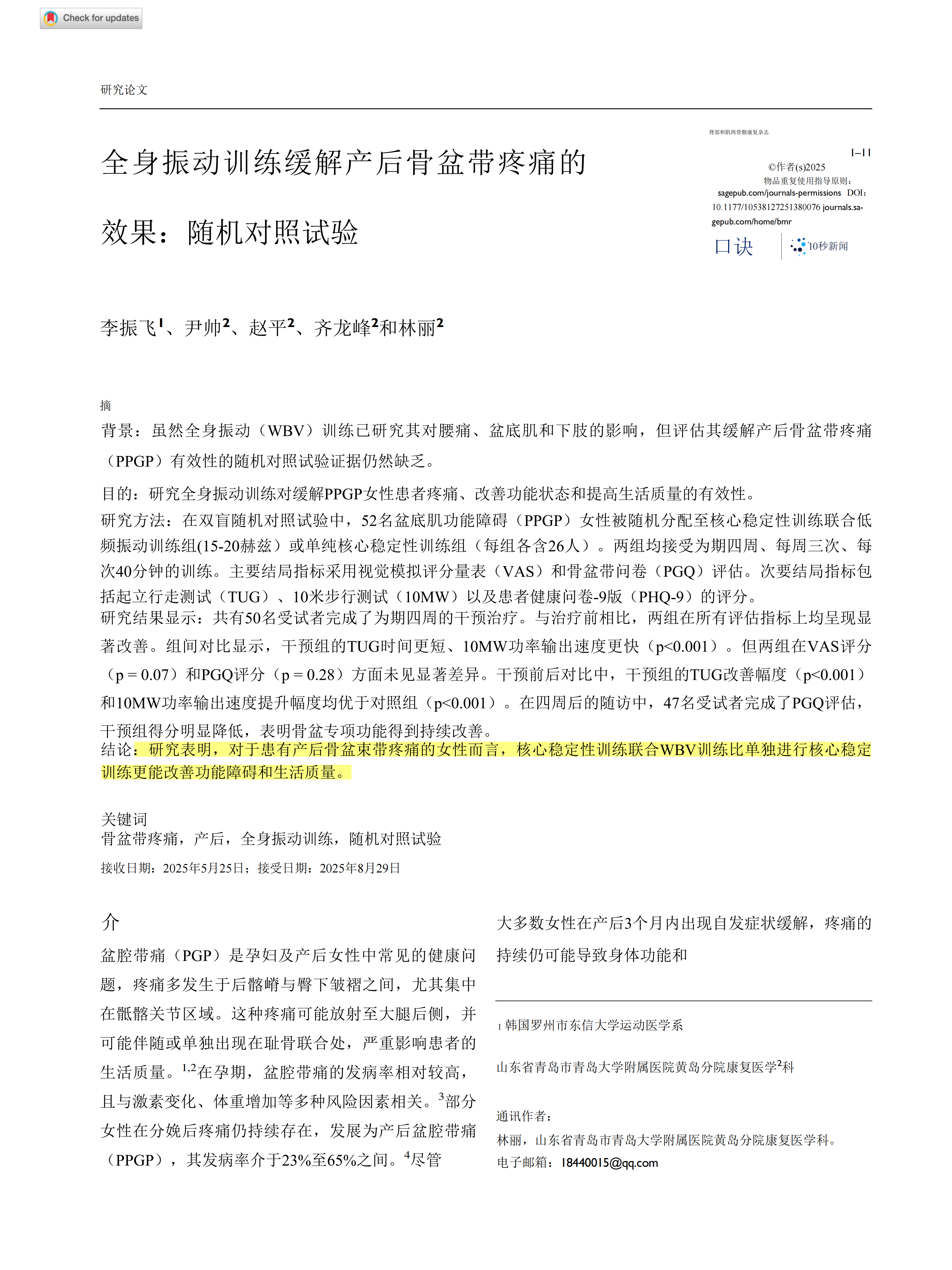 《The efficacy of whole-body vibration training in alleviating postpartum pelvic girdle pain:A randomized controlled trial》