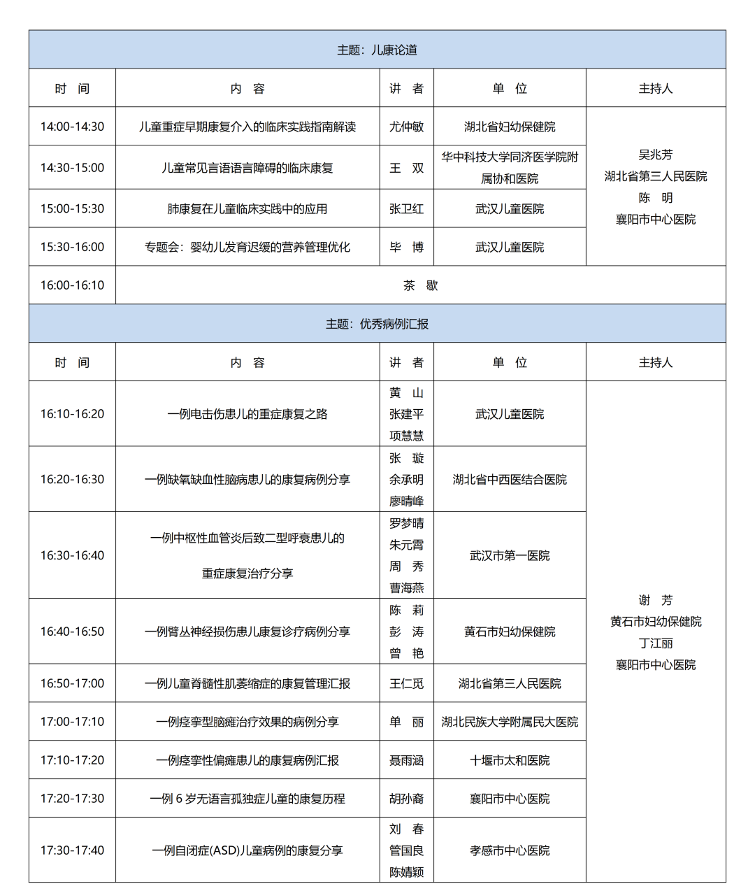 (二)第一届湖北省儿童康复优秀病例分享会通过儿童康复临床病例演讲分享最新诊疗理念,交流临床康复技能,促进我省儿童康复治疗技术的交流与发展,提升康复服务质量。截至报名结束,专委会共收到21个病例,经过遴选,最终确定10个优秀病例进行现场汇报。1.汇报时间:2025年10月18日16:10-17:50。具体日程见“附件1”。2.汇报PPT提交:请于2025年10月10日前,将PPT发送至邮箱huuyoung33@163.com,(注明病例名称+单位全称)。3.单个病例汇报时间在8分钟以内,汇报完毕由专家组进行点评,点评时间2分钟,点评规则见“附件2”。4.汇报成员须注册参会。