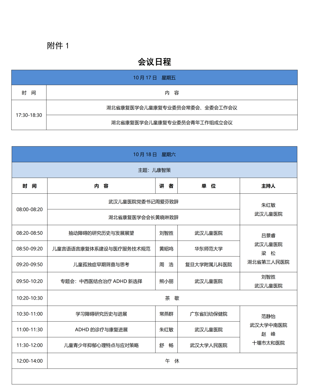 (三)学会工作会议1.2025年10月17日17:30-18:30将召开湖北省康复医学会儿童康复专业委员会常委会、全委会工作会议。请湖北省康复医学会儿童康复专委会第一届委员务必到会(如遇不可抗力因素,须派人参会并持单位盖章的请假说明,无故缺席工作会议将视为自动放弃下届委员资格)。2.按照学会相关工作要求,2025年10月17日17:30-18:30将召开湖北省康复医学会儿童康复专业委员会青年工作组成立会议。请青年工作组候选委员务必到会,届时将进行点名,无故缺席会议将视为自动放弃委员资格。