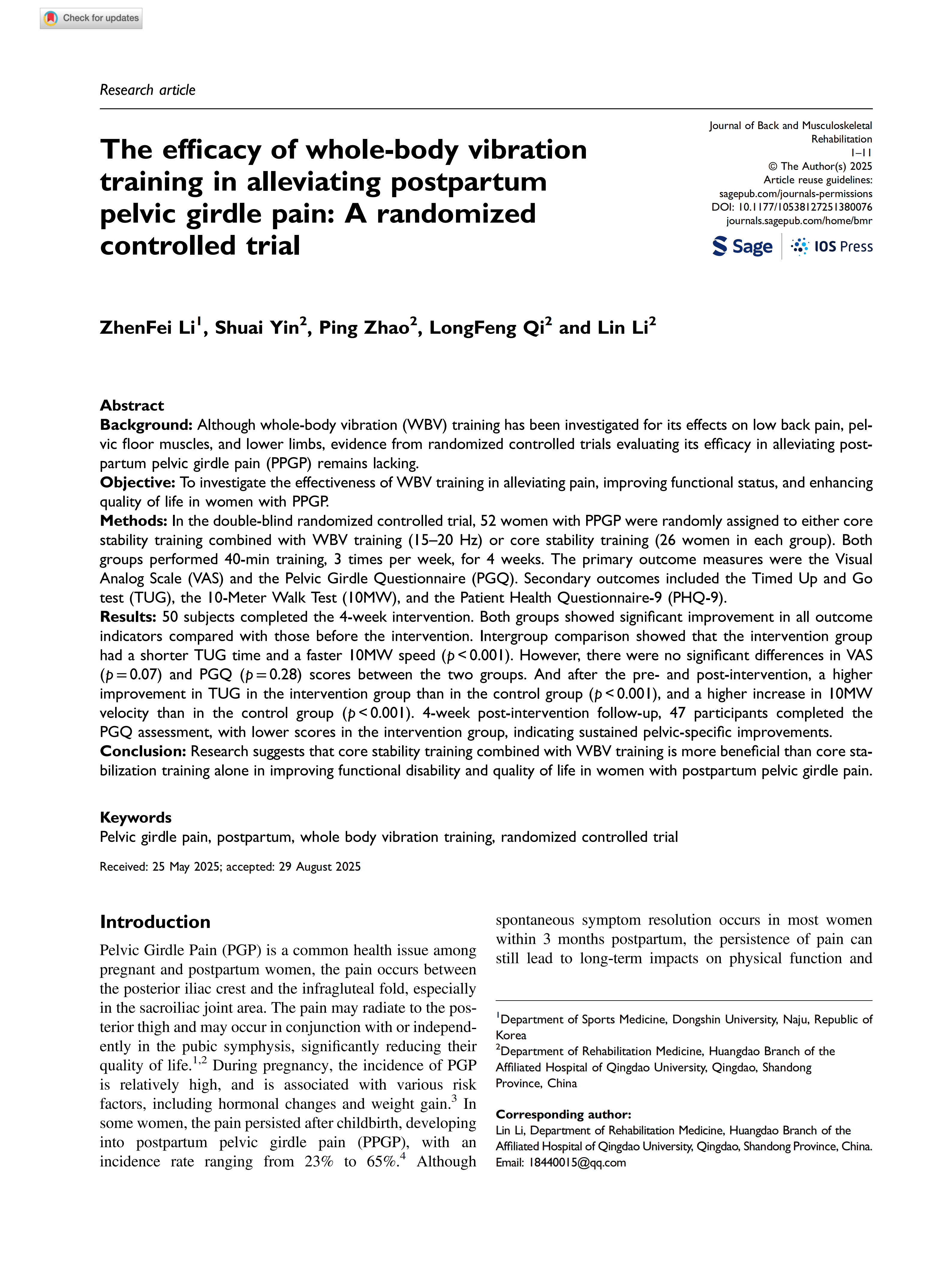 《The efficacy of whole-body vibration training in alleviating postpartum pelvic girdle pain:A randomized controlled trial》