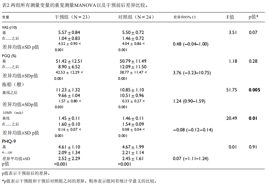 ●组内比较:两组在VAS、PGQ、TUG、10MW、PHQ-9上均有显著改善(p < 0.001)。