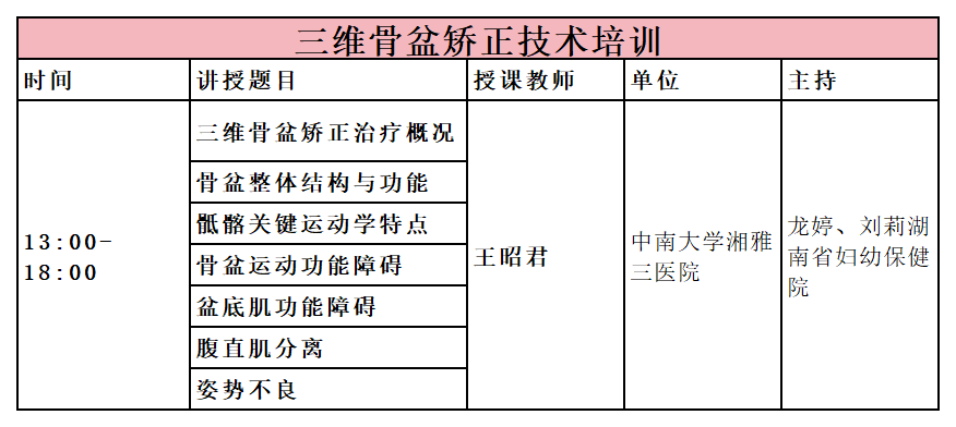 01 会议时间 2025年11月08-10日 02 会议地点 长沙北辰洲际酒店 酒店地址:湖南省长沙市开福区湘江北路三段1500号 联系电话:0731-89668866 03 主要内容 本次培训班分为主会场和分会场及女性盆底解剖培训班。 其主要内容见下: (一)盆底手术专题; (二)单孔及vNOTES专题; (三)盆底康复专题; (四)盆底手术演示; (五)女性盆底解剖培训班。 04 会议日程 05 三维骨盆矫正技术培训班 讲师介绍 王昭君 中国康复医学会运动治疗专业委员会 委员 湖南省孕产健康专业委员会副主委 湖南省脊柱骨伤康复专业委员会委员 湖南省运动治疗专业委员会⻘年委员  湖南省物理治疗专业委员会委员  智能体态分析系统 多维评估:三维人体体态,提供全面的体测数据,多维度评测健康风险。数据精确:检测系统依托用户大数据样本,通过高效的智能算法形成高质量的分析结果。 快速精准:系统将实时识别并自动标记人体45个骨性关键点,彻底告别手工瞄点时代。 直观易懂:评估结果以可视化图表形式输出,直观了解自身的体态问题。 科学灵活:支持“可手动修正自动识别的骨性关键点”,从而确保测试的准确性及个性化。 智能处方:根据检测结果实时匹配个性化运动处方,指导科学运动。 三维骨盆矫正修复系统 三维骨盆矫正修复系统是基于人体行走的步态模式而设计的左右交替倾斜运动模式的设备。可以引起两侧骨盆的交替倾斜同行走时的模式相似,而且速度更快。当振动达到一定频率时,肌肉开始产生牵张反射,能更好的锻炼肌肉间/肌肉内的协调性,激活从下肢到躯干的所有肌群,使全身肌群得到高效的训练。 评估测试: 产品功能: 骨盆运动功能障碍: 骨盆前倾、骨盆后倾、骨盆侧倾、骨盆旋转、髂骨分离、髂骨旋前、髂骨旋后、髂骨内收、髂骨外展、骶骨侧屈、耻骨联合分离。 盆底肌功能障碍: 盆底肌徒手肌力测试可大致反映盆底肌功能障碍程度;进一步确诊需专业医学检查,如盆底超声影像和盆底电生理检查。 腹直肌分离: 指腹壁肌肉从腹部中线的位置向两侧分离。 姿势不良: 肋骨外翻、圆肩驼背。 软件特点 1. 用户管理 对用户的个人信息进行录入保存,也可采集其他的检查评估报告,建立档案,同时进行评估测试并根据评估测试结果进行运动处方的设定。 2.评估测试 软件可指导临床操作人员对用户进行骨盆运动功能障碍评估、盆底肌功能障碍评估、腹直肌分离评估、姿势不良快速评估测试。 3.运动处方的选择 方案库中有多种运动处方,根据评估测试结果从方案库里进行处方选择;也可以在方案库中添加运动处方,根据用户实际情况对处方参数编辑调整,非常方便! 4.用户训练 训练过程中有视频动画、语音提示、文字描述等多维度指导,引导用户标准的完成动作训练。 5. 报告打印 训练完成后,可以针对本次的评估测试及训练打印相关报告,也可以打印历史记录报告。