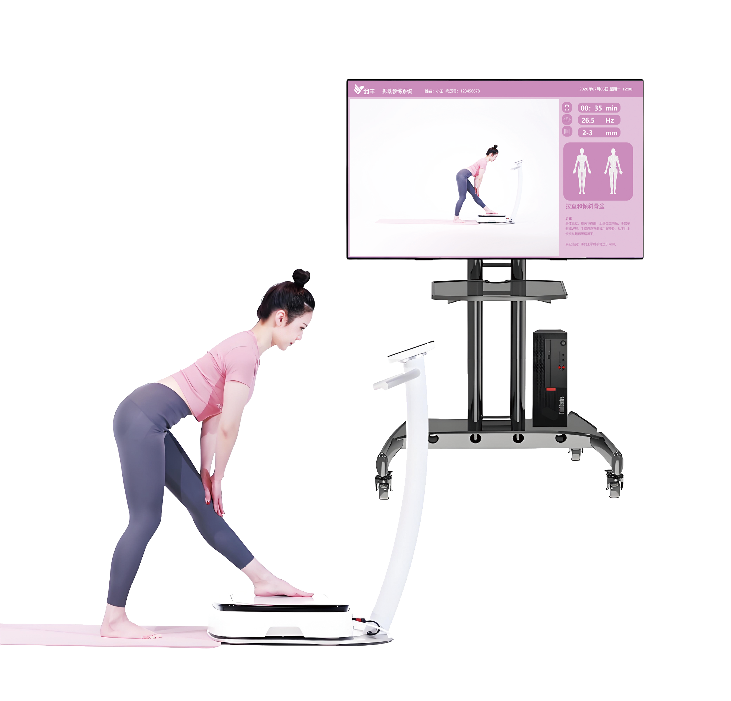 振动训练系统是基于人体行走的步态模式而设计的左右交替倾斜运动模式的设备。可以引起两侧骨盆的交替倾斜同行走时骨盆交替倾斜的变换模式相似,而且速度更快。用于平衡、柔韧性训练,也可提高心肺耐力,尤其是不能进行有氧运动的患者,可以增加全身肌肉力量包括核心肌力。
