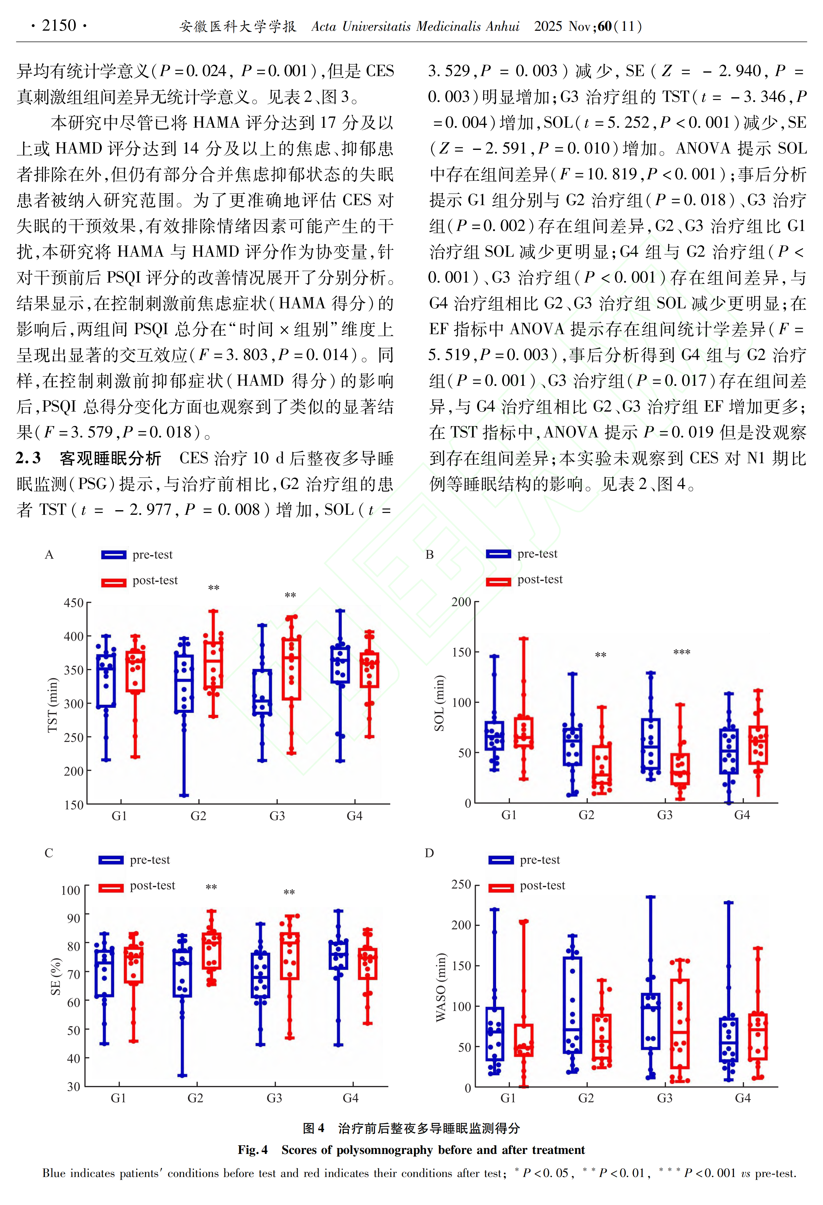 在客观睡眠指标上,G2 治疗组的患者睡眠总时间(TST)增加,睡眠潜伏期(SOL)减少,睡眠效率(SE)明显增加;G3 治疗组的 TST 增加,SOL 减少,SE 增加 。这说明 CES 治疗能够有效增加患者的睡眠时间,缩短入睡时间,提高睡眠效率 。而在睡眠结构方面,研究未观察到 CES 对 N1 期比例等睡眠结构的影响 。