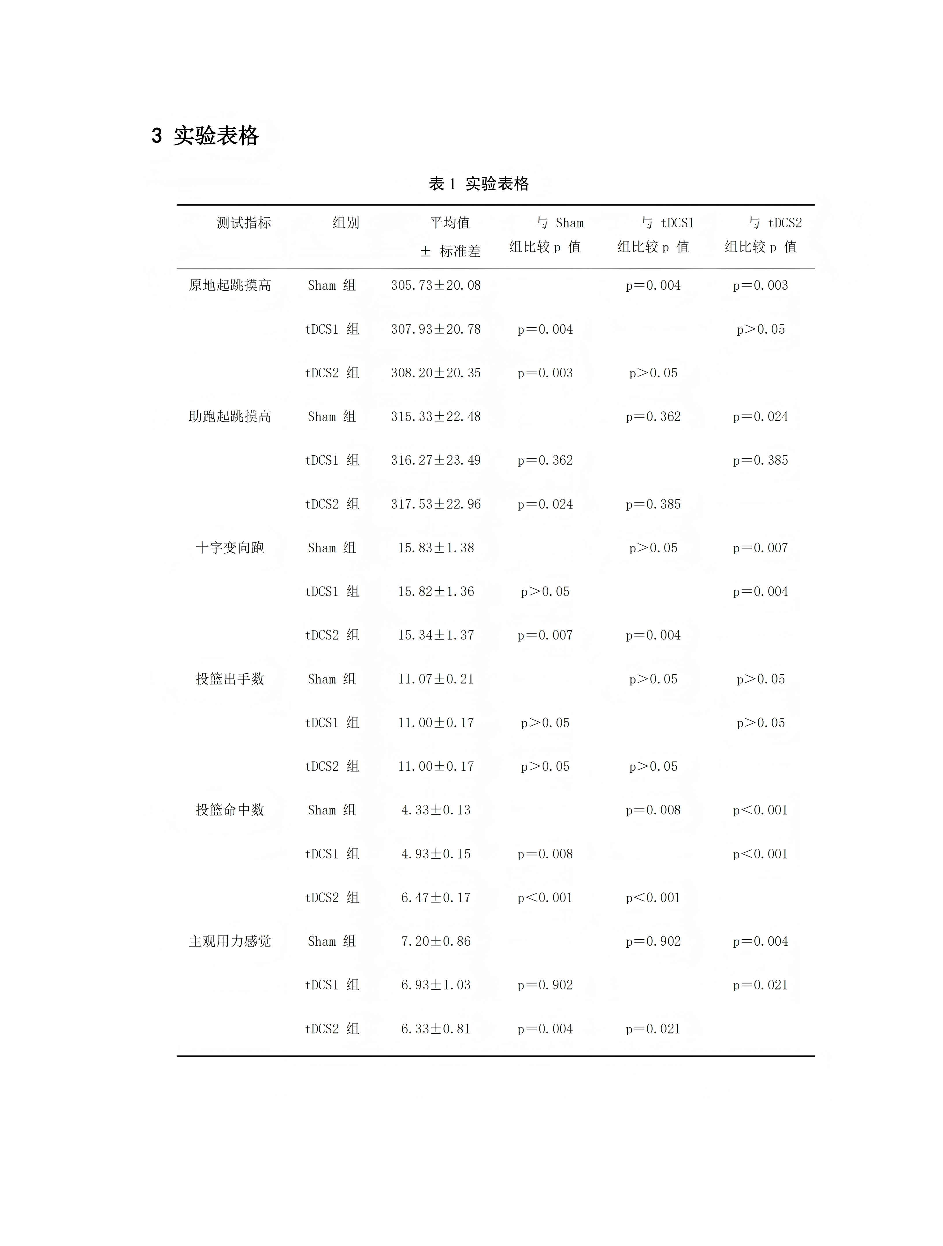 实验采用 “随机交叉单盲设计”,每位运动员都要完成3次实验:接受假刺激(Sham)、1mA强度真刺激(tDCS1)、2mA强度真刺激(tDCS2),每次实验间隔12小时以排除干扰。刺激后经过15分钟统一热身,运动员们要完成站立摸高、原地起跳摸高、助跑起跳摸高、十字变向跑、1分钟三分球自投自抢、主观用力感觉(SRPE)6项核心测试。